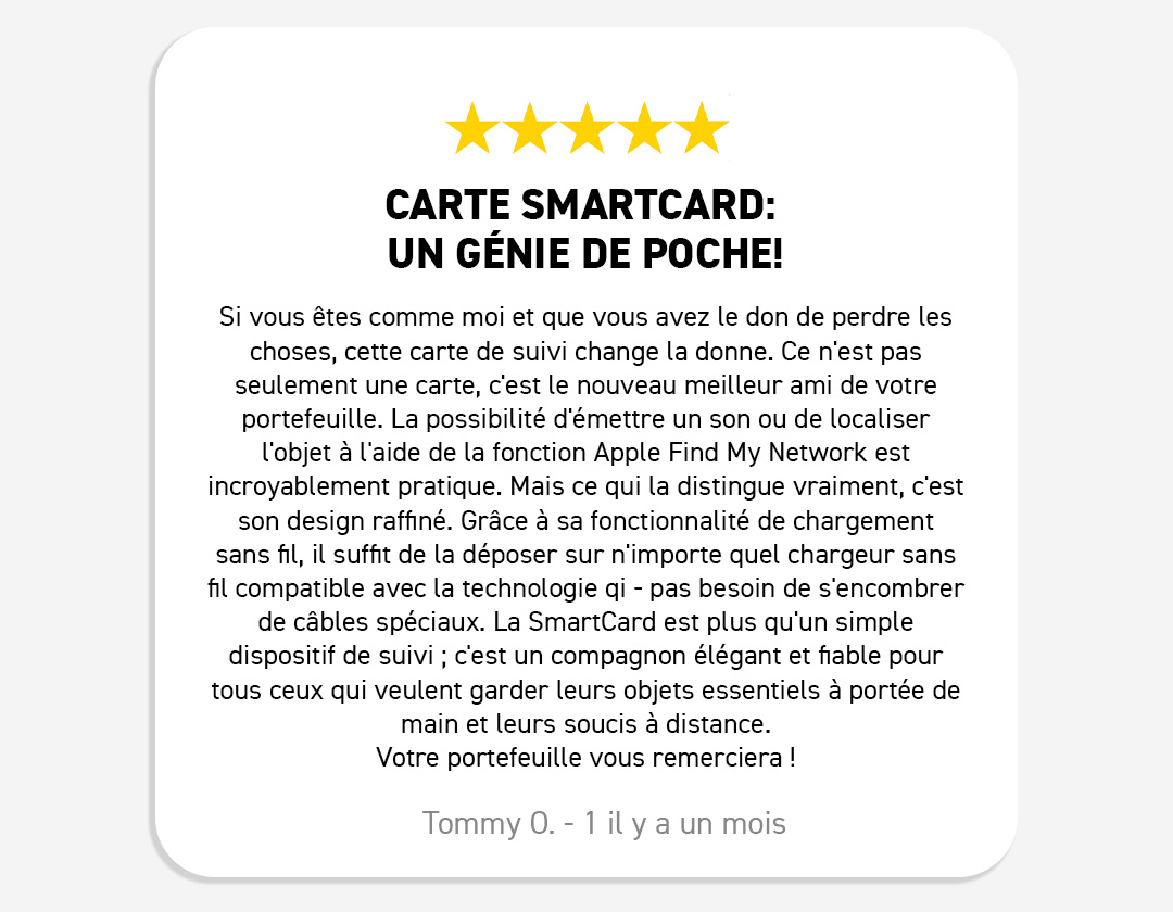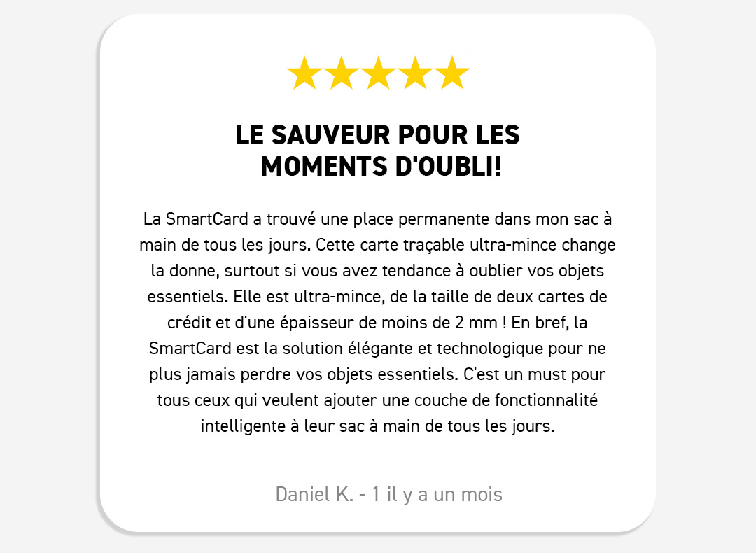 Après avoir essayé divers traceurs, la KeySmart SmartCard se distingue par son efficacité et son design. Elle s'adapte parfaitement à mon portefeuille, et l'autonomie de la batterie a dépassé mes attentes. Elle a été incroyablement utile pour garder une trace de mes affaires.